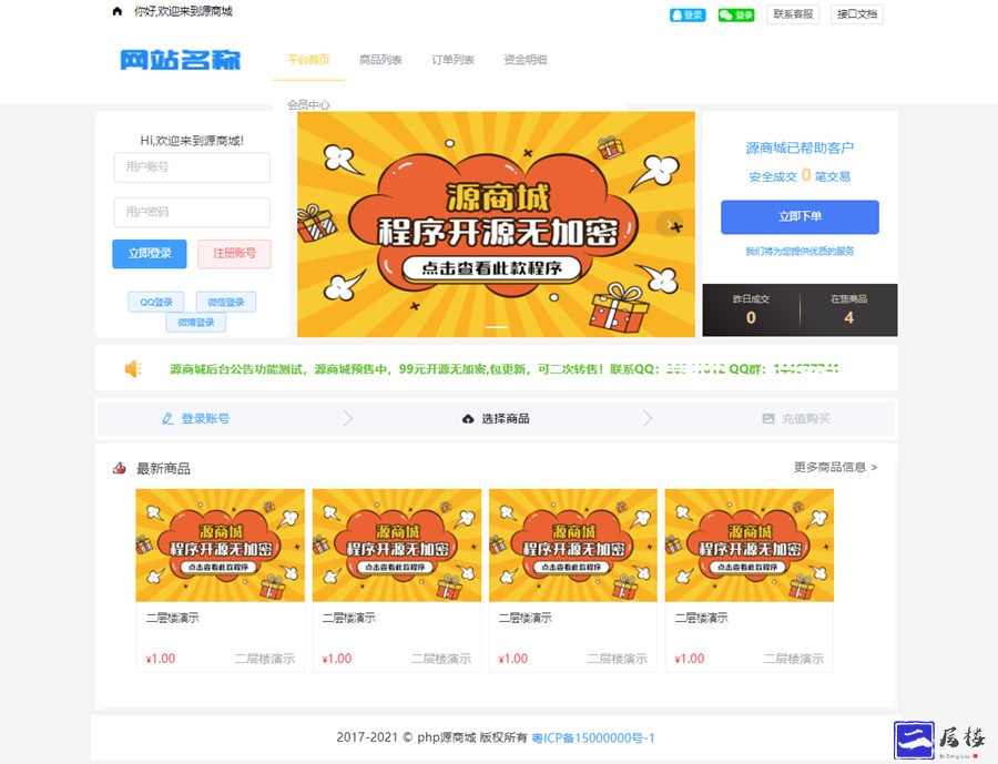 源商城V1.2开源版本 专业的虚拟产品销售平台源码,简洁大气虚拟商城源码,可做发卡网站使用,支持对接官方支付、易支付、码支付、免签支付等、安装包上传到网站输入域名按照提示配置一键安装即可。