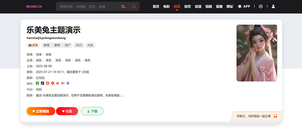 电影先生Mxone魔改主题带有完整的后台管理,支持白昼切换、首页自定义、自定义幻灯片、导航自定义、侧边导航自定义、手机导航自定义、横向图展示、独立解析设置、明星页、专题页、资讯页、个人中心、下载页、直播页、详情页、手机自适应等苹果cms模板该有的功能基本都有。