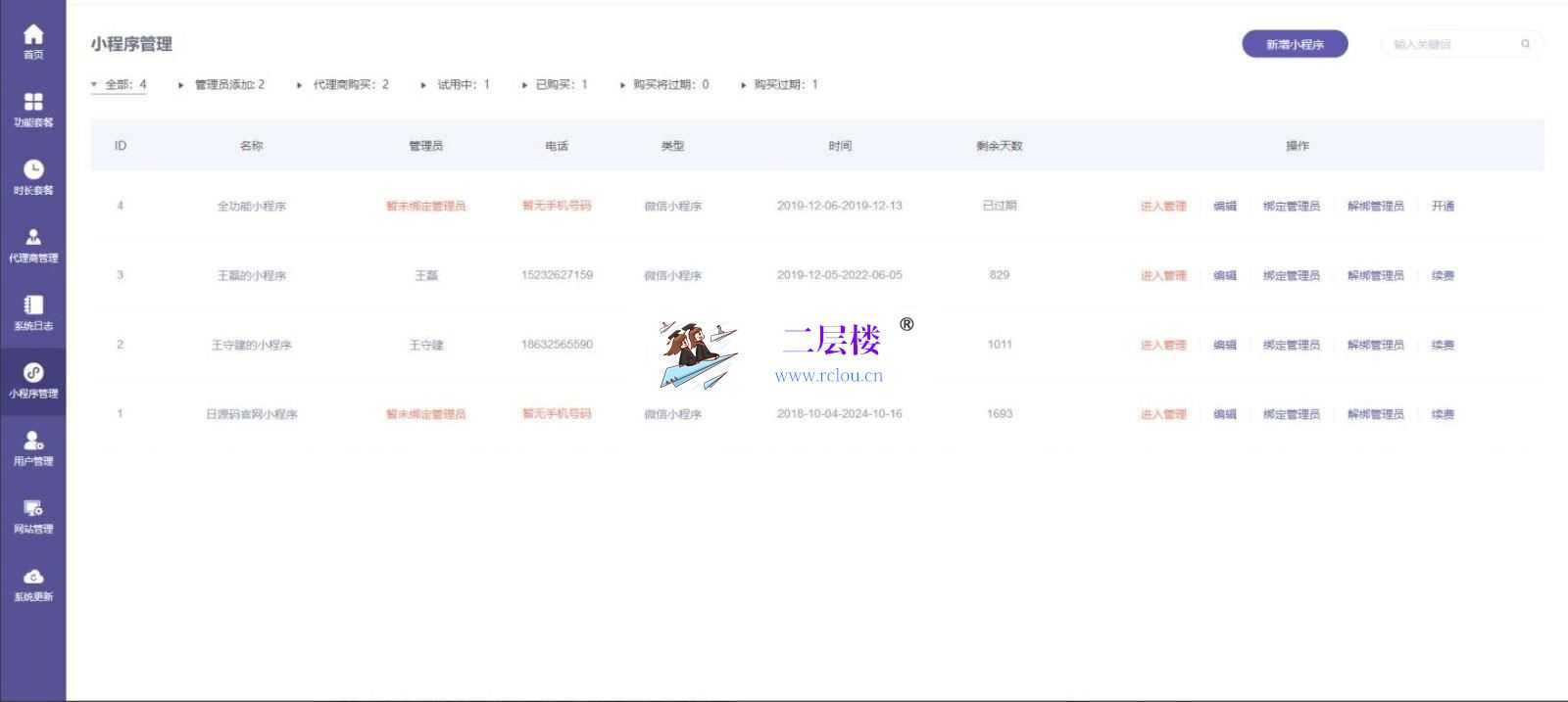 代理商管理:拥有底层源码系统,发展自己的代理商,列表清晰展示各代理商状态,详细设置对代理商账号信息、创建小程序的个数、系统到期时间等进行管理。