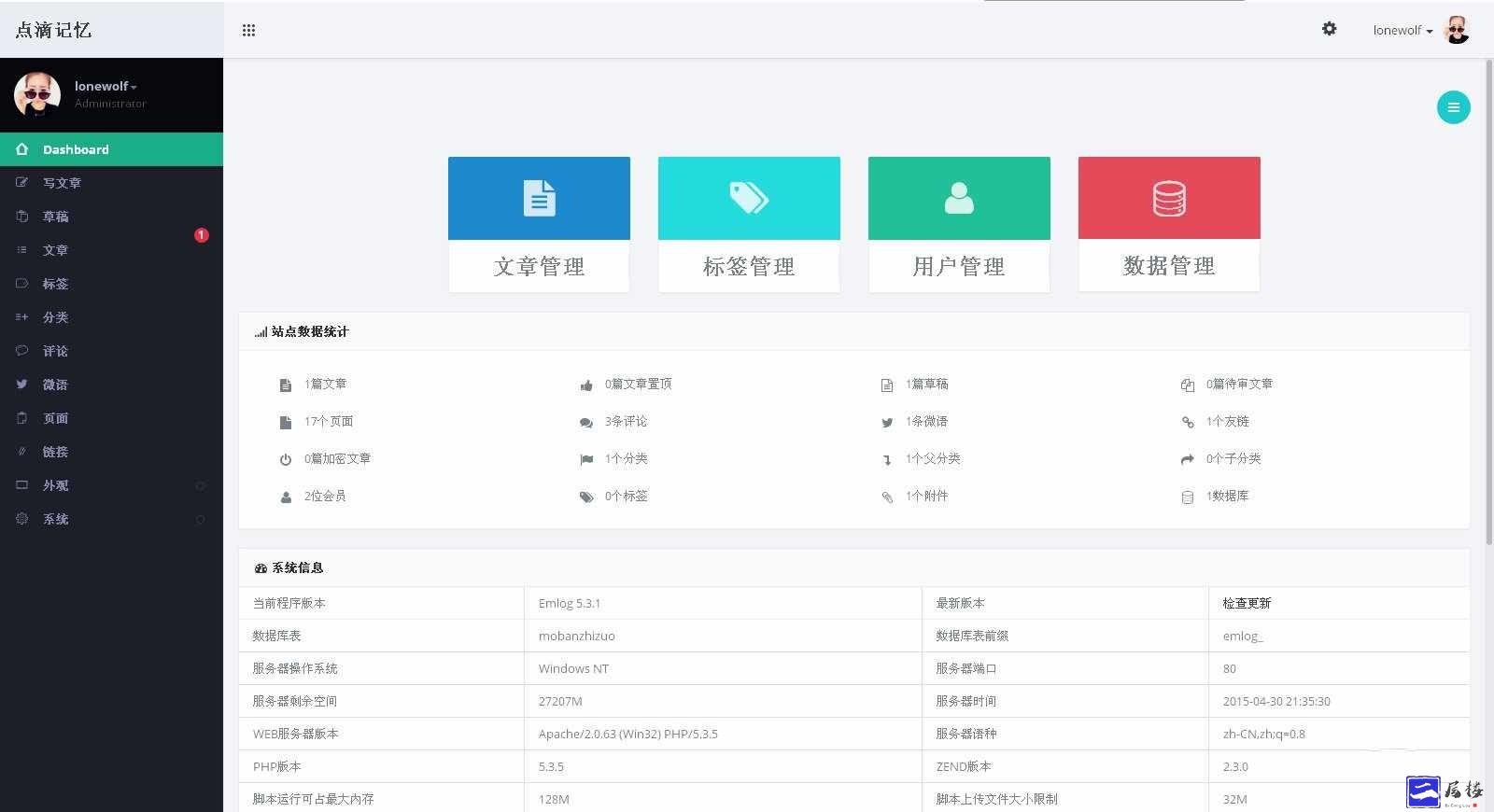 lscale主题是一套emlog后台界面主题,基于目前非常流行的响应式框架bootstrap开发,使用了专为bootstrap设计打造的Font Awesome字体图标,响应式设计主流左右两栏布局,完美支持电脑, 平板、手机和其他主流终端设备相比,和emlog简单的默认背景主题相比,整体非常高大上。