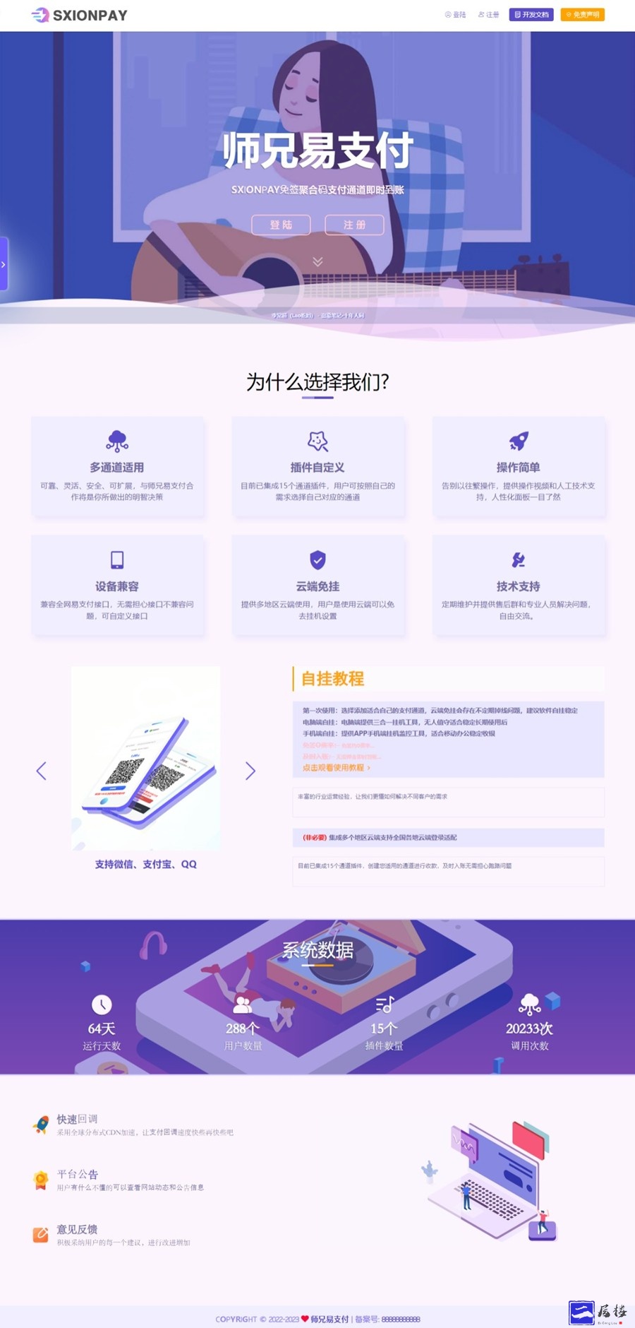 师兄PAY模板第四套提取于一个好看的音乐模板,小编重制适配源支付源码同样支持其它的易支付模板和码支付模板,模板由html,css,js文件组成,模板加上音乐播放器如果不需要自己删除调用代码,外观粉色大气、水波纹动态响应式模板支持PC手机自适应,小编看了也挺喜欢的,模板中的功能小编也做了对源支付系统后台对接,上传到对应文件中可以直接使用,其他的易支付或者码支付的首页模板也都是大同小异,自己稍微修改一下html也就能使用了,有需要的小伙伴自行下载研究。