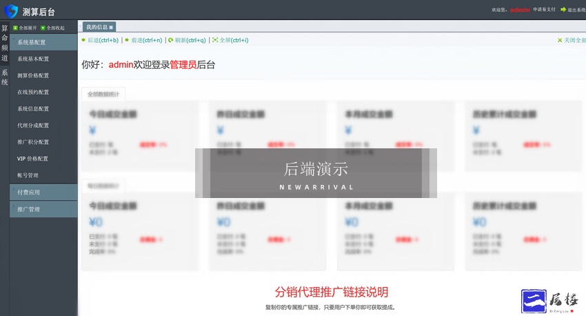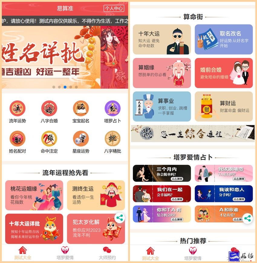 2023新版UI起名风水塔罗占卜星座运势测算网站源码,附带有视频教程和文本教程,小编亲测了安装了一下,大概功能可以正常运行,搭建需要两个域名,一个用于前端另一个用于后端,测试了一下支付接口都是正常的,小编测试的过程中删除了大量乱七八糟的广告文件,由于源码来源网络收集,所以小编大概的审视了一下代码和文件,确保源码可以安全运行,功能还是挺多了,有喜欢测算类型网站的小伙伴可以拿去体验一下,该源码仅供学习参考。