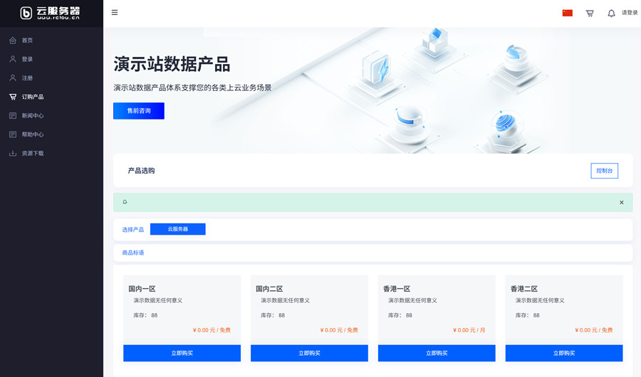 这款 IDC 主题模板展现了对行业需求的深度理解。针对 IDC 产品的特殊性,它支持 “配置动态更新” 功能 —— 当客户在购物车中修改服务器的 CPU 核数、内存大小等参数时,价格会实时重新计算并同步显示,无需跳转至商品详情页;对于需要按周期付费的产品(如年付、季付),购物车能自动计算不同周期的折扣价格,并标注优惠力度,刺激客户选择更长期的套餐。此外,模板还内置了 “优惠券 / 折扣码” 模块,支持满减、百分比折扣等多种优惠形式,且能与 IDC 常见的 “新用户首单减免”“老客户续费折扣” 等活动无缝对接。