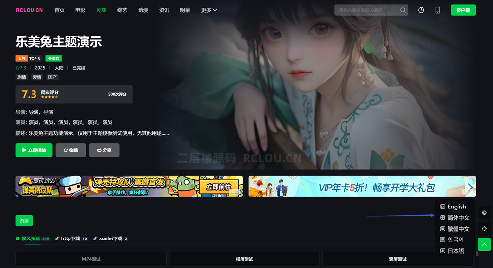 首涂模板第45套仿奇艺电影主题苹果CMS模板,已集成国际多语言翻译功能,支持中、英、日、韩、繁五种语言切换,后台带有多个DIY模块,可以根据自己的观感和网站的定位,DIY 出自己喜欢的页面样式,轮播图样式,播放页样式,首页样式等都可以自己Diy。小编在测试过程中,对源码进行了一些 Bug 修正,解决了不少使用过程中可能遇到的小问题。这套模板其实是短视主题的改版。它最大的变化是由原来的插件版本改为了独立的后台管理,这一改动让安装过程变得相对简单一些。模板的功能还是比较完善的,无论是影视内容的展示、分类,还是用户的基本浏览体验,都能得到较好的满足。模板有需要的朋友可以自行研究,打造出独具个性的影视网站。