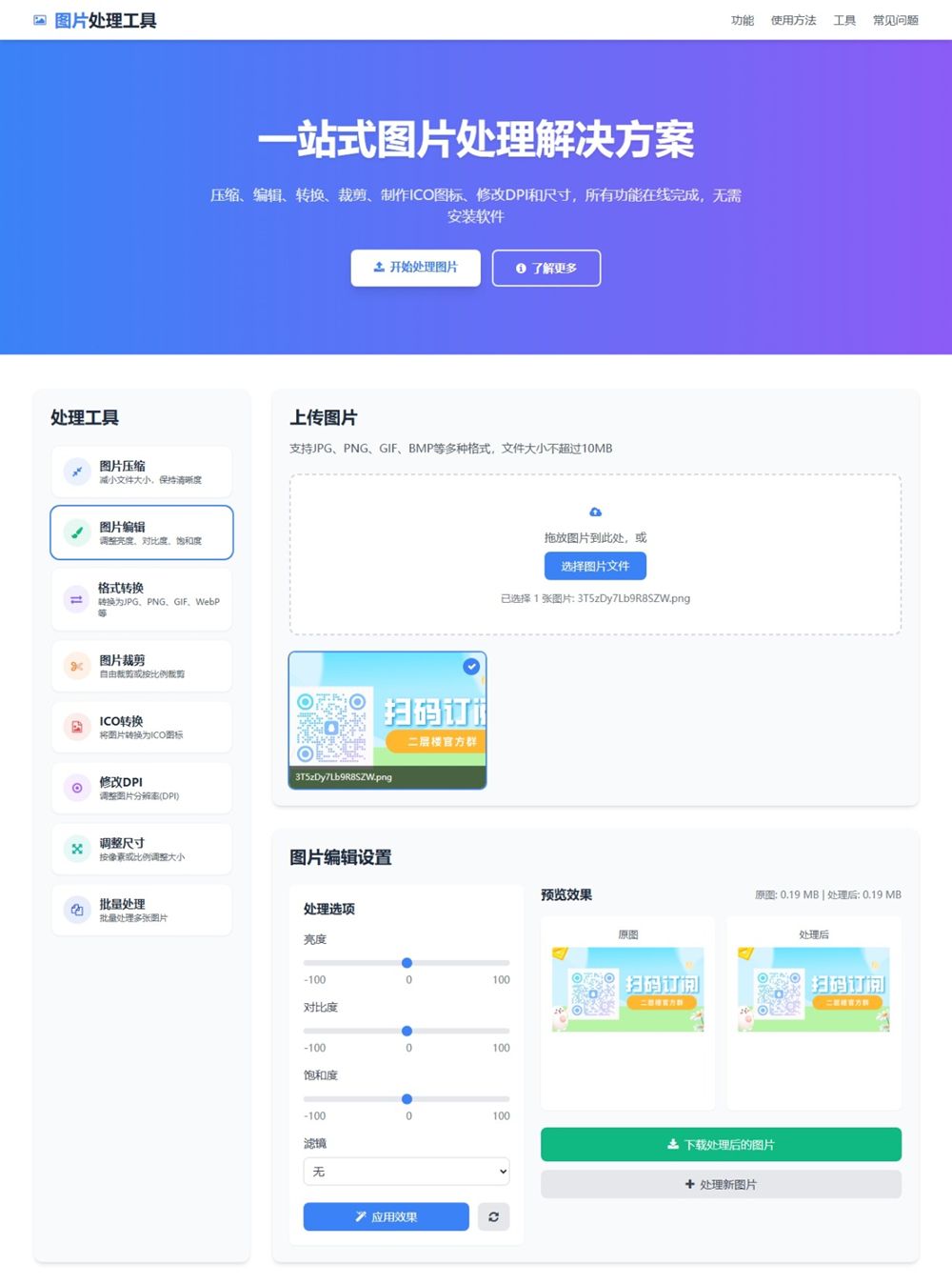 此外,该网站采用现代UI设计,有着清晰的视觉层次和直观的导航结构,如此一来,使用户能够轻松找到并使用所需的图片处理功能。并且,代码结构清晰,注释完善,因此便于未来扩展更多功能。