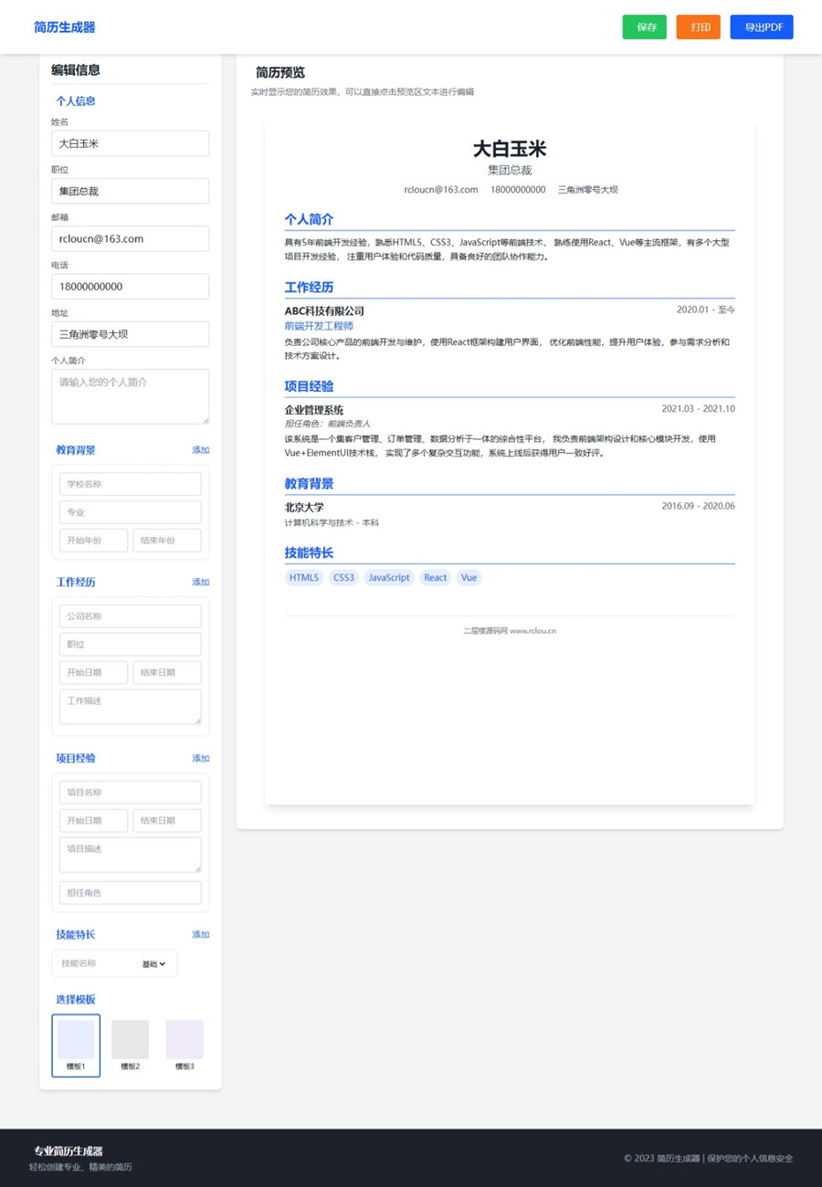 该简历生成器具有以下特性和功能:直观的双栏布局:左侧为编辑区,右侧为实时预览区,方便用户即时查看编辑效果。完整的简历内容模块:包含个人信息、教育背景、工作经历、项目经验技能等核心简历模块,每个模块都支持动态增删项。多模板支持:提供三种不同风格的简历模板,用户可以一键切换,满足不同场景的需求。双向编辑功能:用户可以在左侧的表单中输入内容,也可以直接点击预览区的文字进行编辑,提高了操作的灵活性。导出功能:支持打印和导出PDF格式,方便用户投简历。现代UI设计:采用TailwindCSS打造,配色优雅、清晰的排版层次,流畅的动画效果,符合Awwwards级别的视觉标准。响应式设计:适应不同的屏幕尺寸,在移动设备上获得良好的体验。使用时只需填写各种信息即可实时生成专业简历,并根据需要导出为PDF或直接打印。