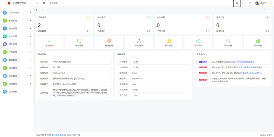 2026小笑授权系统,支持php8可以二开,专为个人开发者及开发团队量身打造,致力于提供高效便捷的个人源码管理解决方案。依托小笑多应用授权系统的核心能力,您可随时随地为用户完成授权添加、授权管理等操作,无需繁琐流程,轻松掌控授权全流程。