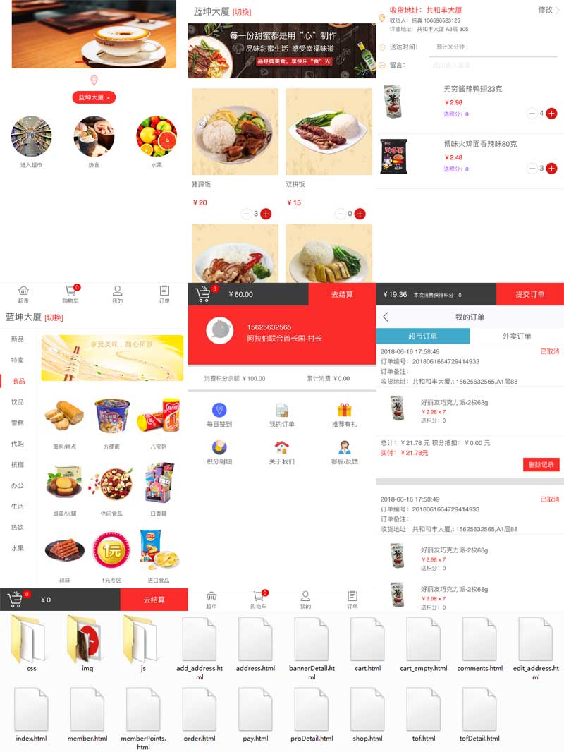 手机端超市商城,外卖订餐,热食点餐系统网站模板。主要有:超市、热食、水果、购物车、我的主页、订单详情、结算、配送地址等一共16个页面html下载。