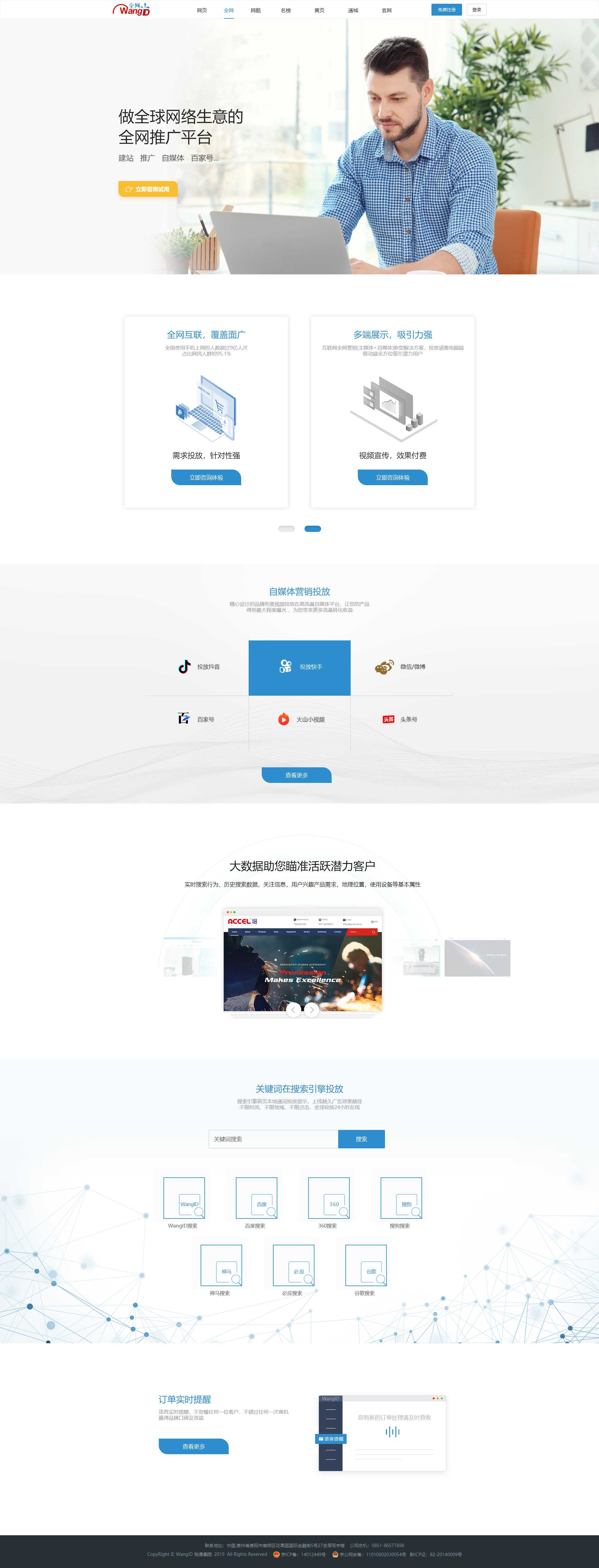蓝色清新的自媒体网络推广,搜索引擎投放,网络营销专题活动页面设计模板html下载。