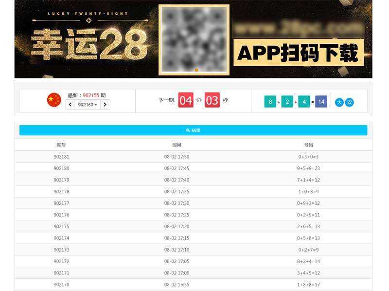 简单的幸运28数字开奖猜大小单双页面模板,带倒计时开奖和最新期开奖结果列表参考。