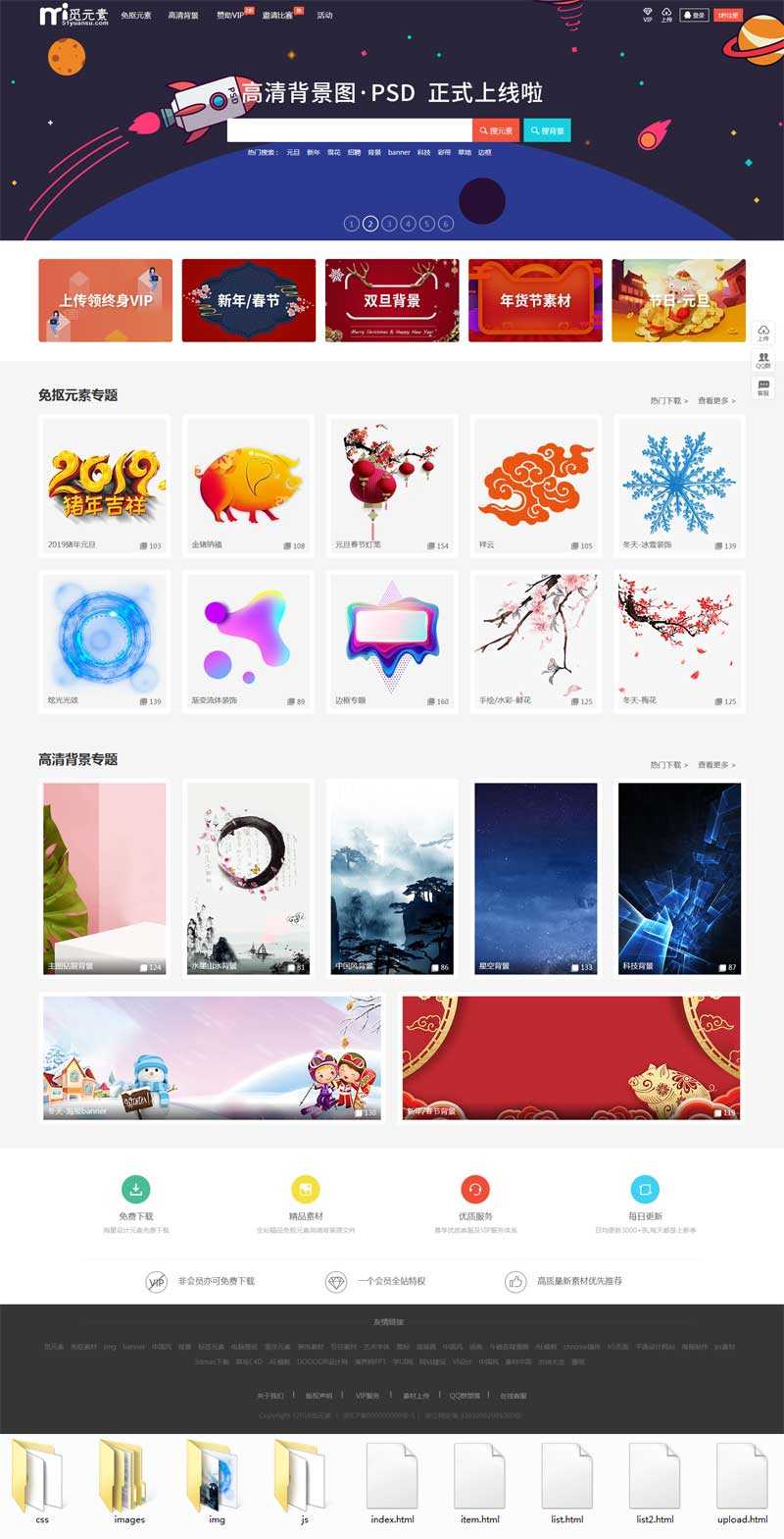 仿某图片元素资源下载素材站模板,免费的设计元素下载网站模板html下载。主要有:首页、列表页、详情页、发布上传页等总共5个页面。