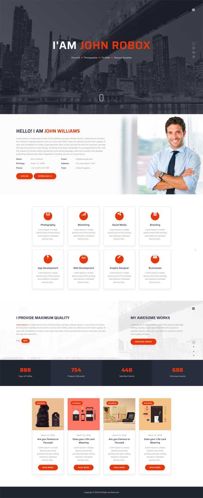 一款宽屏大气的个人投资组合html5模板。可用于的个人资料,设计师,自由职业者,营销人员,工作历史,项目和其他个人信息单页模板。
