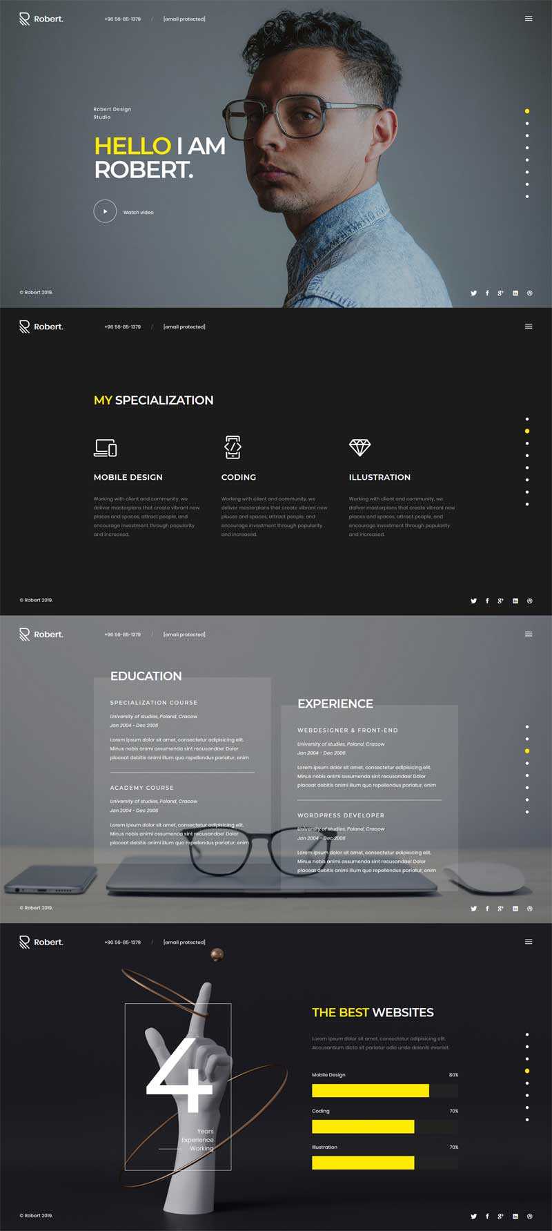 黑色全屏的网页设计师,平面广告设计师,IT技术个人简历主页,网页滚动展示模板html下载。