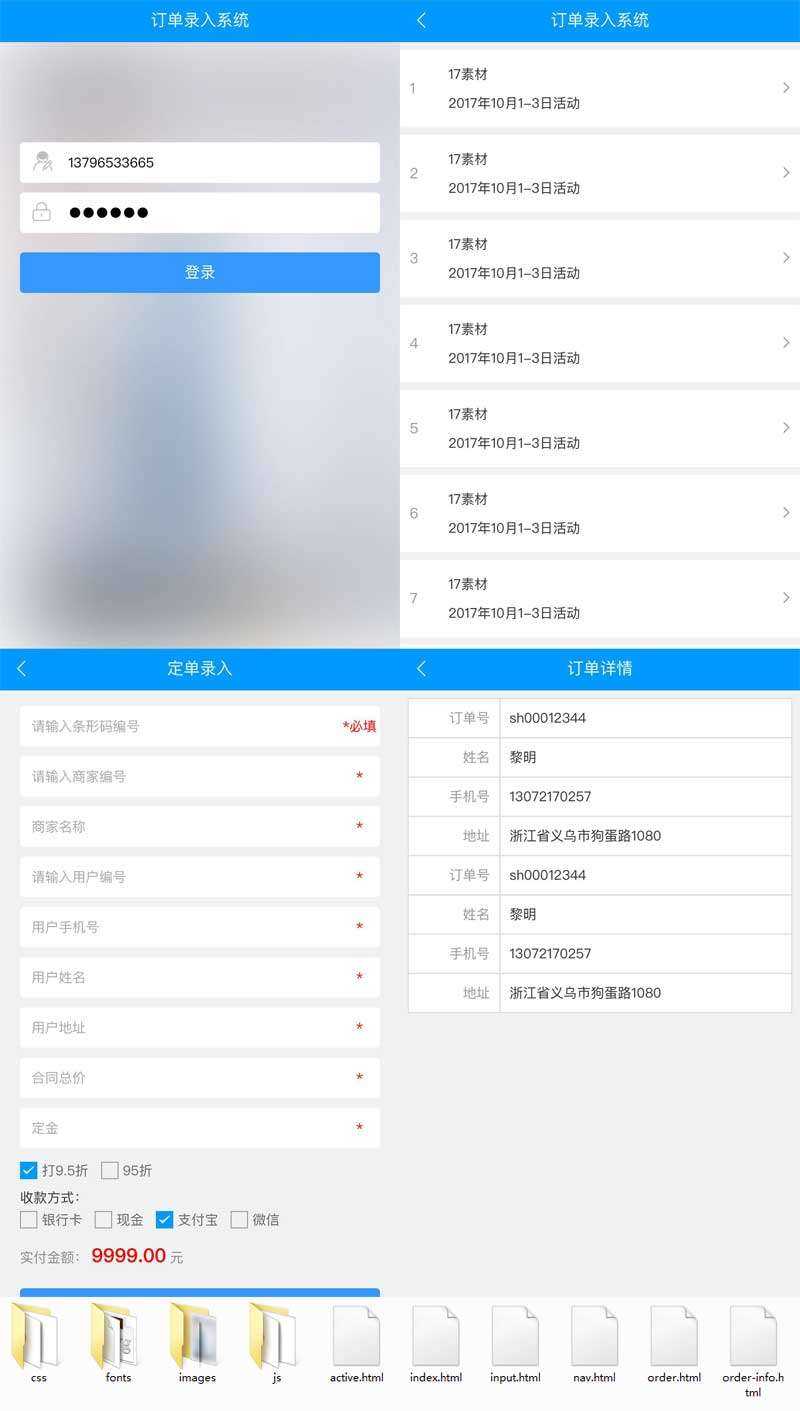 手机端企业销售订单录入系统后台管理界面模板html下载。主要有:登录界面、订单录入列表页面、订单详情页面、订单信息填写页面等总共6个手机页面。