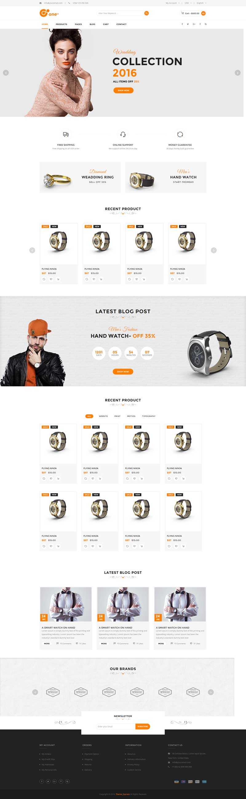 简洁橙色的响应式设计的电子商务商城模板,适合销售配饰、手表,时尚或任何其他的在线手表品牌购物网站。它是用最新Bootstrap构建框架和HTML5和CSS3。包括所有必要的页面。所以你可以很容易从我们的模板准备你的网站。
