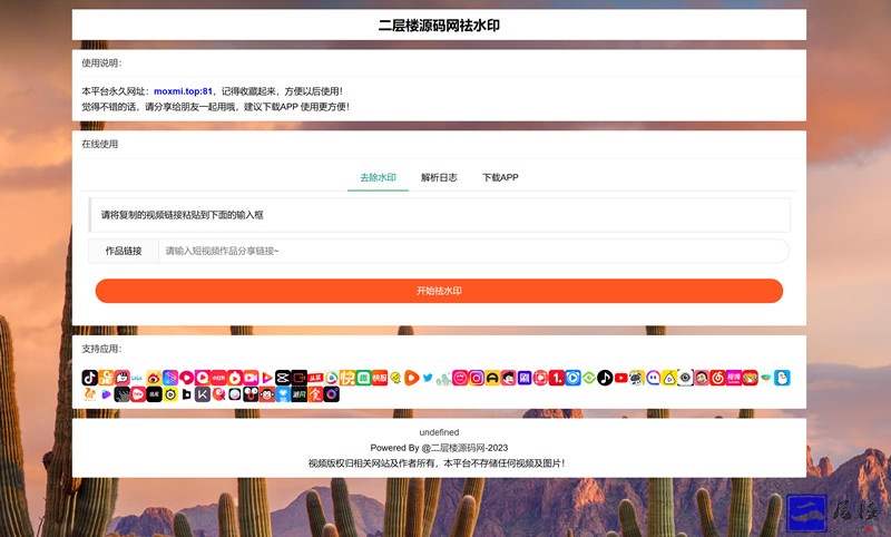 新版抖音快手小红书去水印系统网站源码,支持大概几十种平台,小编测试了一下加入动态背景,需要自己对接api接口,有时间自己找找解析接口。